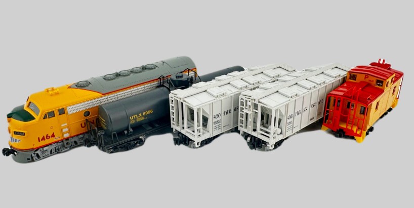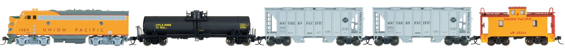 Chaque coffret de train de marchandises F7 comprend une locomotive EMD F7A de Kato , deux wagons-trémies couverts ACF, un wagon-citerne et un fourgon de queue peint de façon appropriée. Les locomotives F7A sont compatibles DCC et peuvent facilement être mises à niveau pour la commande numérique. Les trains peuvent être complétés par une grande variété de wagons, notamment le coffret de train de marchandises mixtes de Kato USA, également disponible, qui propose plusieurs wagons de marchandises peints individuellement dans un emballage similaire.